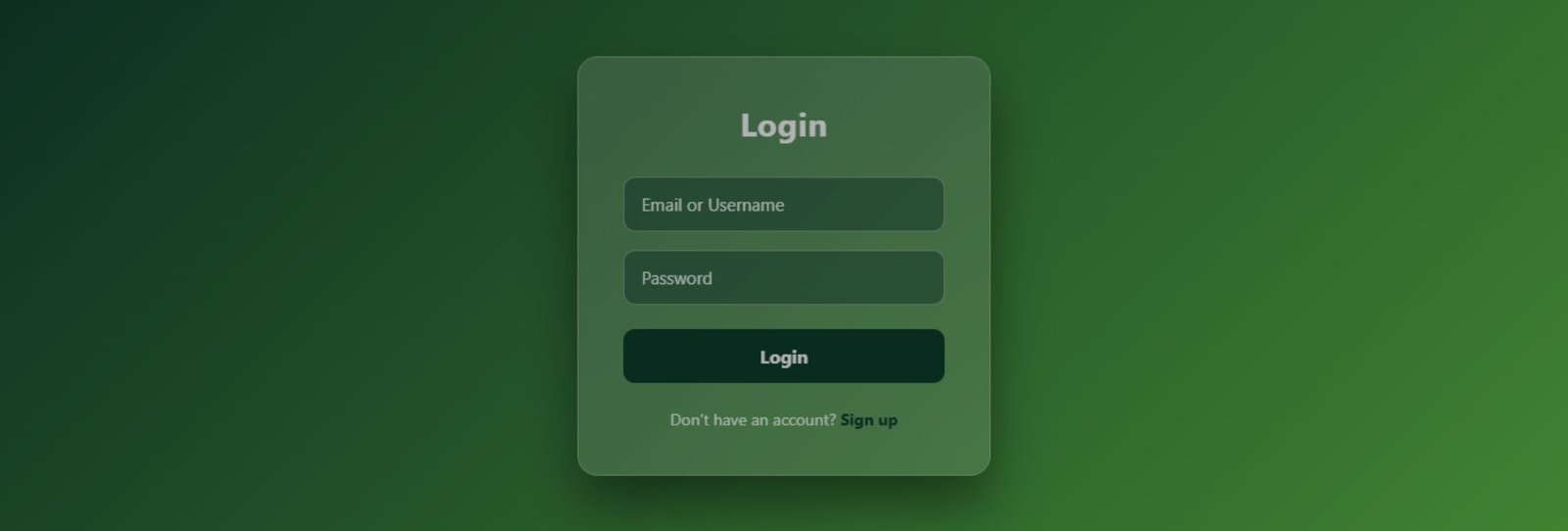 - Layout: Full-page background, centered glass login card with inputs and button.